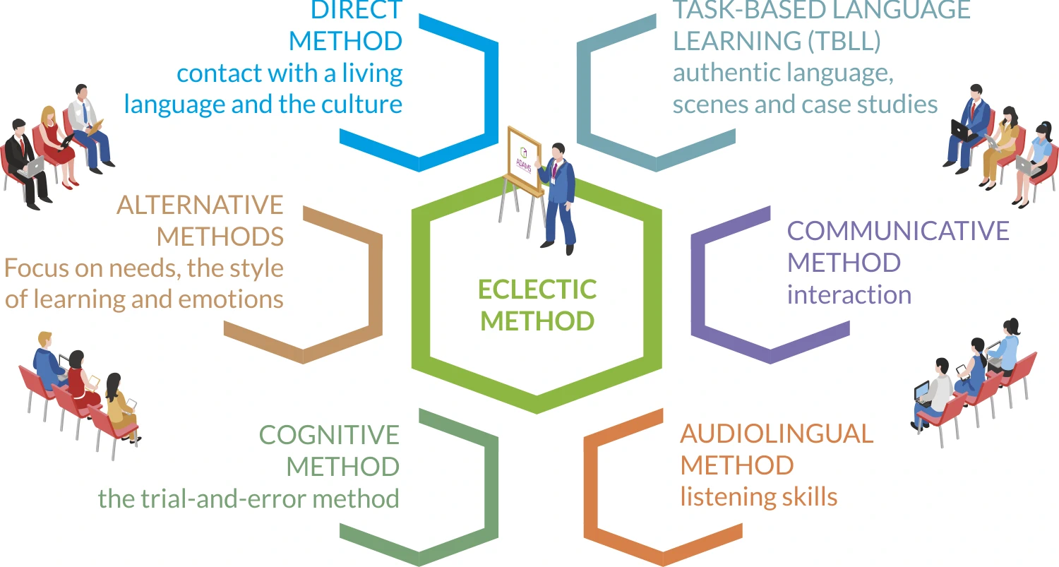 While teaching adults, we focus on what this person should know, learn and understand, so we match proper methods and techniques of teaching them. During lessons, our qualified and experienced teachers pay attention to diverse means of communication, techniques and methods for Participants to learn the language as it is used in various situations.